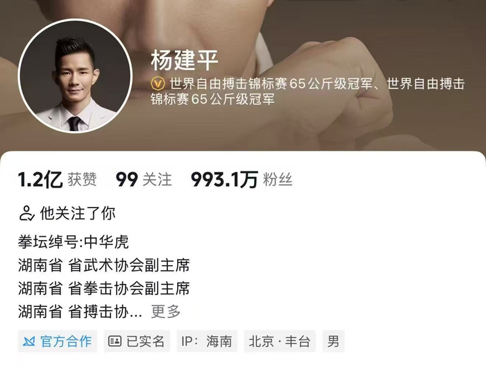 当综合格斗的灯光褪去,杨建平并没有止步于昔日的光环。而是完成了一次漂亮的跨界——从职业赛场走向产业运营,从运动健将变身新媒体传播大咖。